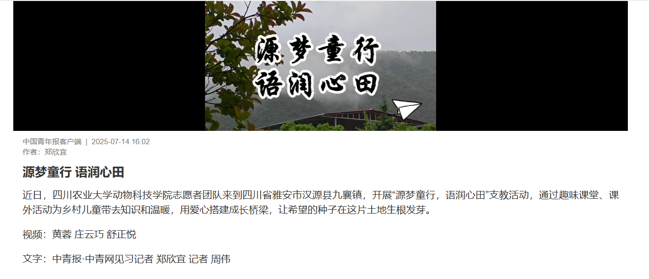 近日,四川农业大学动物科技学院志愿者团队来到四川省雅安市汉源县九襄镇,开展“源梦童行,语润心田”支教活动,通过趣味课堂、课外活动为乡村儿童带去知识和温暖,用爱心搭建成长桥梁,让希望的种子在这片土地生根发芽。