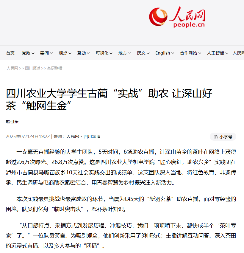一支毫无直播经验的大学生团队,5天时间,6场助农直播,让深山苗乡的茶叶在网络上获得超过2.6万次曝光、26.8万次点赞。这是四川农业大学机电学院“匠心赓红,助农兴乡”实践团在泸州市古蔺县马嘶苗族乡10天社会实践交出的成绩单。这支团队深入当地,将红色教育、非遗传承、民生调研与电商助农紧密结合,用青春智慧为乡村振兴注入新活力。