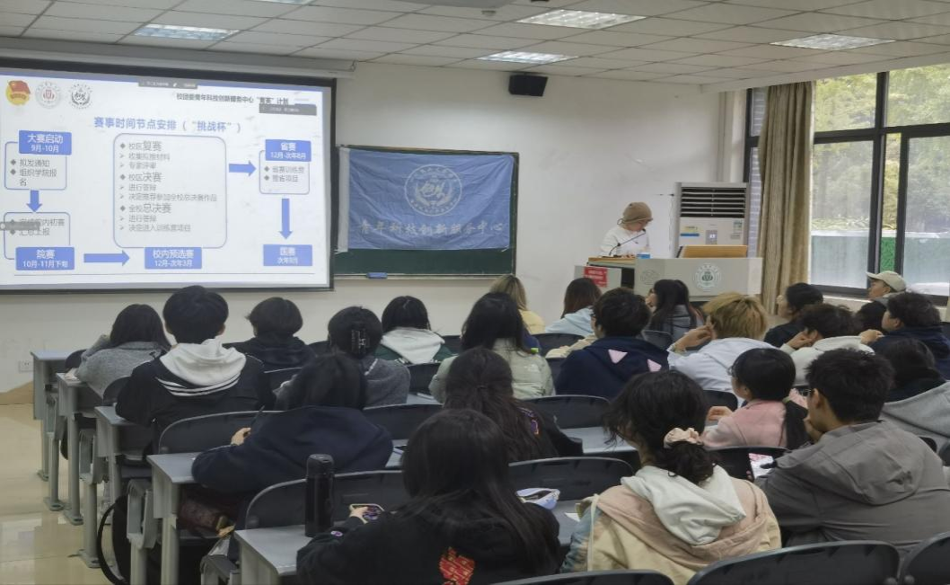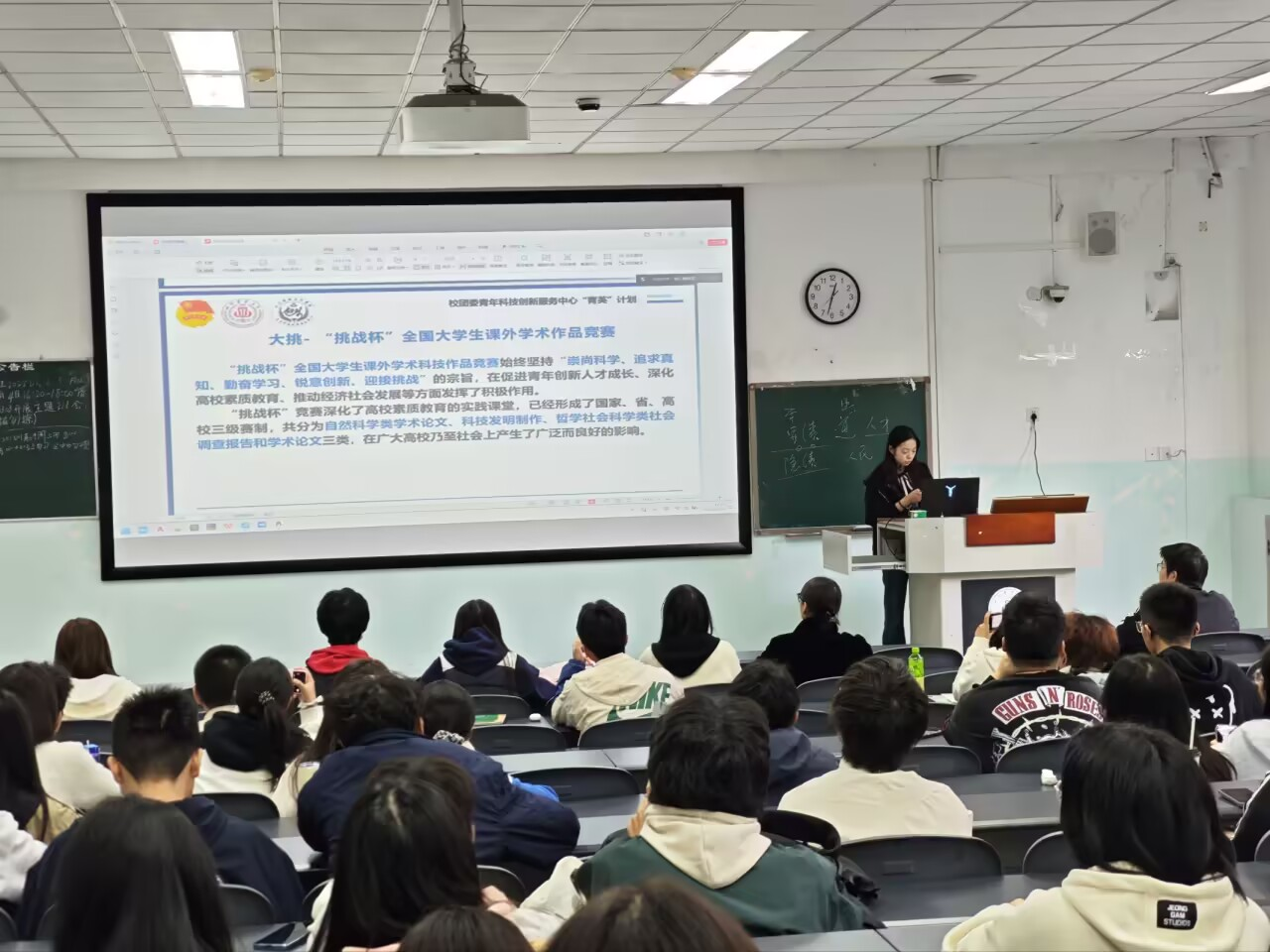 中心负责人任丽频围绕青创体系职能定位、科创赛事赛程安排、赛事奖励办法细则及工作统一规范标准四大核心内容展开系统讲解。其中,针对科创赛事赛程与奖励办法,她重点强调了“以清晰路径引导参与,以多元激励点燃热情”的工作思路:通过拆解赛事全周期时间节点、明确备赛关键阶段任务,帮助同学们精准把握备赛节奏;结合《“挑战杯”等竞赛奖励办法》中,详细解读国家级、省级、校级奖项对应的二课加分、保研加分及项目孵化支持等政策,强调校院协同共同激发同学科创热情。