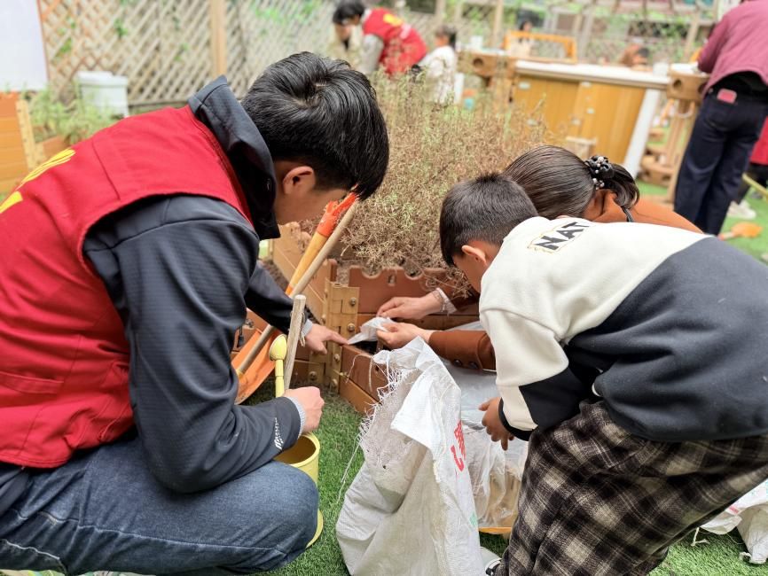 “小朋友们,育苗四要素是什么呀?”园艺学院志愿者们通过介绍黄瓜、苦瓜等常见植物习性,带领光华新城幼儿园的小朋友们松土施肥、浇水覆膜,体验种植乐趣,为培育儿童生态环保意识注入青春力量。
