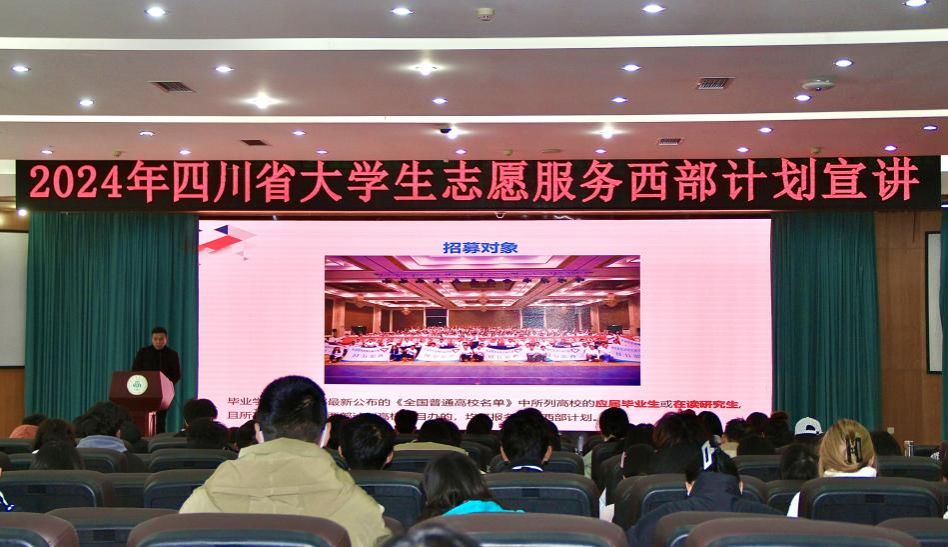 12月19日上午,“志愿西部行 建功新时代”——2024年四川省大学生志愿服务西部计划四川农业大学宣讲会在雅安校区十教一楼报告厅举行。雅安团市委副书记周卓锐、西部计划志愿者代表作主题分享,200余名同学参会。
