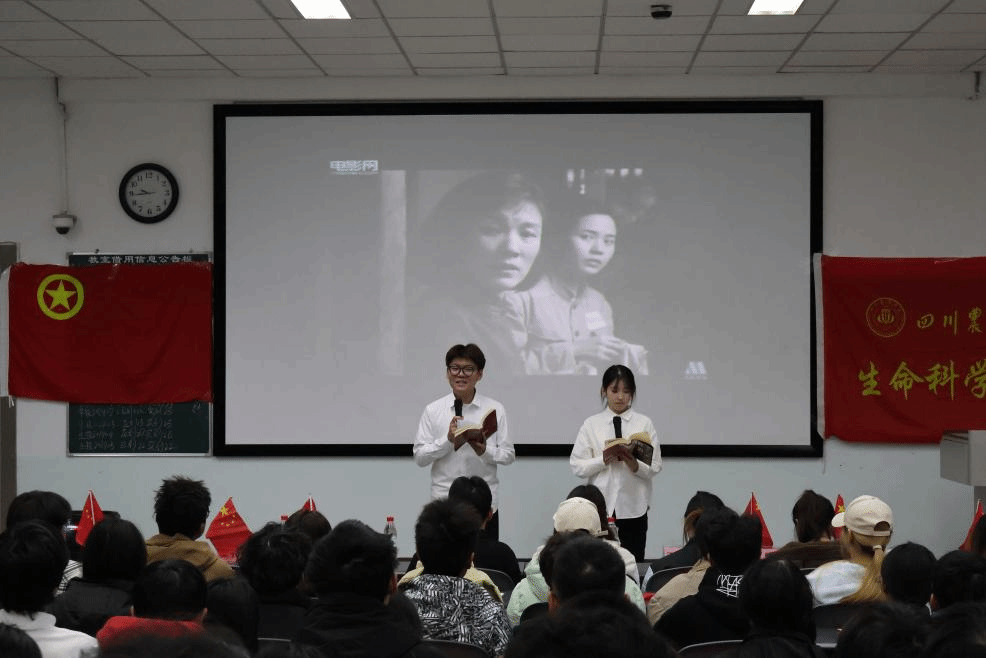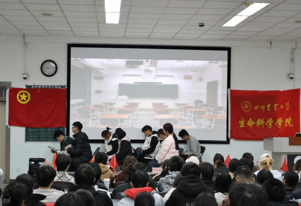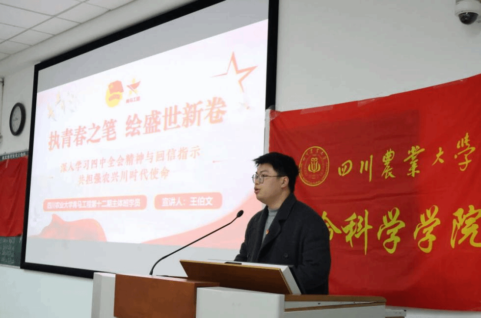 理论铸魂:深学细悟凝聚青春共识。活动在激昂的团歌声中拉开序幕。第十二期校青马班学员王伯文以“学习党的二十届四中全会精神全会精神,共绘‘十五五’蓝图”为题,解读了全会核心要义和“十五五”规划部署,并结合新闻播报视频,生动呈现国家发展蓝图。他特别分享了川农大校友关祖苹扎根基层、通过直播助农推动乡村振兴的鲜活案例,生动诠释“强农兴农”初心,激励团员将川农大精神与“十五五”发展蓝图相结合,让青春在服务国家战略中绽放光彩。