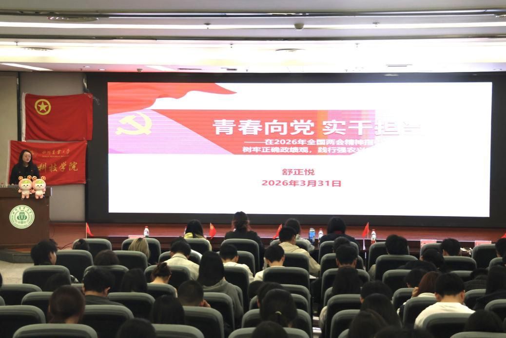3月31日下午动物科技学院团委直属部门流动团支部、草业科技学院团委直属部门流动团支部、动物科学202501班团支部、动物科学202508班团支部、草学202502班团支部、草学202503班团支部于成都校区图书馆报告厅开展了“感悟两会精神,喜迎百廿芳华”三—四月示范性班团活动,本次班团活动分为四个篇章,共计180余名同学参加。
