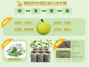 首次提出“新品种、新技术、新模式”三新智慧种植模式,即利用首创的半限根栽培育苗方法高效推广自主新品种;集成“智能化监测、精准化水肥管理、轻简化花果调控、立体化‘天敌-趋避植物’防控系统”的四化栽培技术;构建“果+粮”、“果+菌”间套作的循环种植模式,有效提升产量和梨果品质。