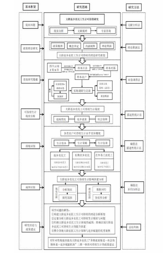 大龄农民工群体日益壮大,关注大龄农民工退场和生计问题符合实现社会共同富裕的愿望。本研究聚焦大龄返乡农民工可持续生计问题。首先,在分层等概率随机抽样原则下,采用深度访谈和调查问卷方式获得四川、云南6市18县36乡镇72村2544户农户数据。其次,利用描述性统计分析大龄农民工城市退场、返乡就业、社会保障现状,从生计资本、生计策略和生计结果三个维度科学测度大龄返乡农民工可持续生计状况。再者,从现实层面探究形成大龄返乡农民工生计问题的原因,并利用回归分析法探究大龄返乡农民工可持续生计的促进因素。最后,整合各地大龄农民工生计保障与返乡赋能的优秀案例,从“三个聚焦”提出针对性的政策建议。基于研究结果,团队凝练出“多维就业渠道-社会保障体系-返乡赋能机制”的三维一体发展模式,以期为破解大龄返乡农民工生计难题、推动大龄返乡农民工群体赋能乡村振兴提供新思路。研究成果获得省部级批示1个,获得10份采纳证明,实践推广过程获感谢信11封。团队现已发表SCI/CSSCI论文11篇,其中单篇最高影响因子达15.6,成果两次在国际性会议中交流汇报并获得优秀论文,为有效解决大龄返乡农民工的生计可持续问题,深入实施乡村振兴战略贡献力量。