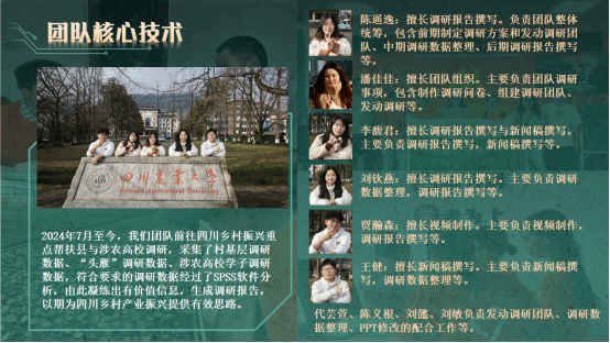 团队背靠四川农业大学乡村产业振兴带头人培育头雁项目,积极响应《乡村全面振兴规划(2024—2027年)》关于引导青年入乡就业创业的指示,前往四川涉农高校调研青年学子、45个乡村振兴重点县调研青年头雁,针对涉农高校青年头雁培育体系存在优化空间、乡村青年头雁孵化机制未形成系统架构、涉农高校与乡村间青年头雁孵化合力尚未彰显,提出政、校、乡三方完善对策及打造政府护航、涉农高校与乡村协同的“三轮驱动”孵化模式。团队目前已辅助推动3个校地平台的搭建、形成8篇高水平论文、收获近20份乡村合作意向书、入选全国重点团队,成员潘佳佳参与四川省头雁项目帮扶指导工作专题研讨会并作相关汇报,最终调研报告被四川省农业农村人才发展服务中心采纳,相关事迹被新华网等20余家主流媒体报道,浏览量突破200万次。我们希望通过努力赋能青年头雁孵化工作!