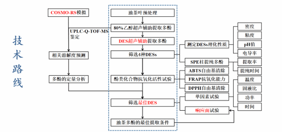 油茶是我国重要的木本油料作物,连续三年写入中央一号文件。油茶叶片是茶多酚、多糖等生物活性物质的优良来源。我国油茶种植面积高达9000万亩,每年修剪将产生油茶叶片700余万吨,其中约60%被燃烧或填埋,产生二氧化碳约694万吨,造成极大的浪费和污染。项目聚焦“绿色生产”与“双碳”目标,首创基于COSMO-RS理性设计的低共熔溶剂(DESs)技术体系,突破传统乙醇提取法效率低(<30%)、成本高(占40%)、污染重的技术瓶颈,实现多酚得率131.63±0.85 mg/g、多糖得率19.01%,分别较传统提升2和2.5倍,并首次鉴定出50多种多酚活性物质,为油茶副产物高值化利用,助力乡村振兴与农业碳中和提供了重要基础。项目发表中科院一区SCI论文8篇,累计影响因子63.7,授权发明专利3项、实用新型专利4项,一作均为团队成员,同时与3家企业达成合作意向。